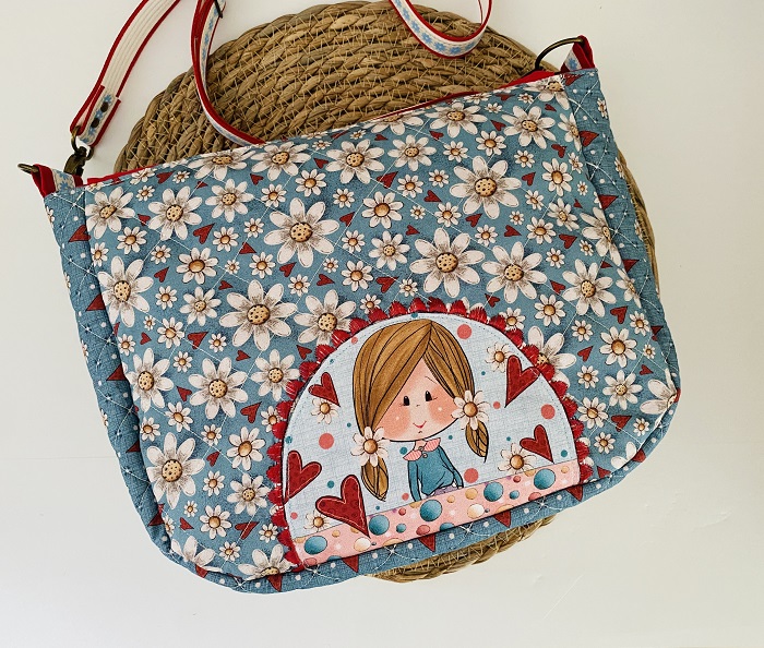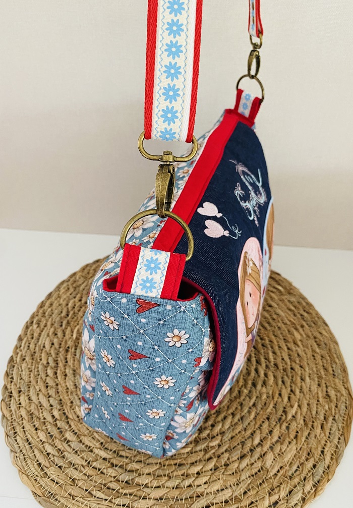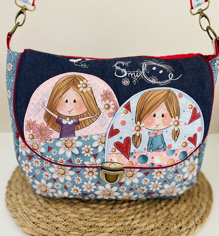 L’extérieur se compose d’un tissu jean, et des empiècements de coton avec de jolies finitions : rabat et dos imprimés et points de broderie, pour un look vintage original.